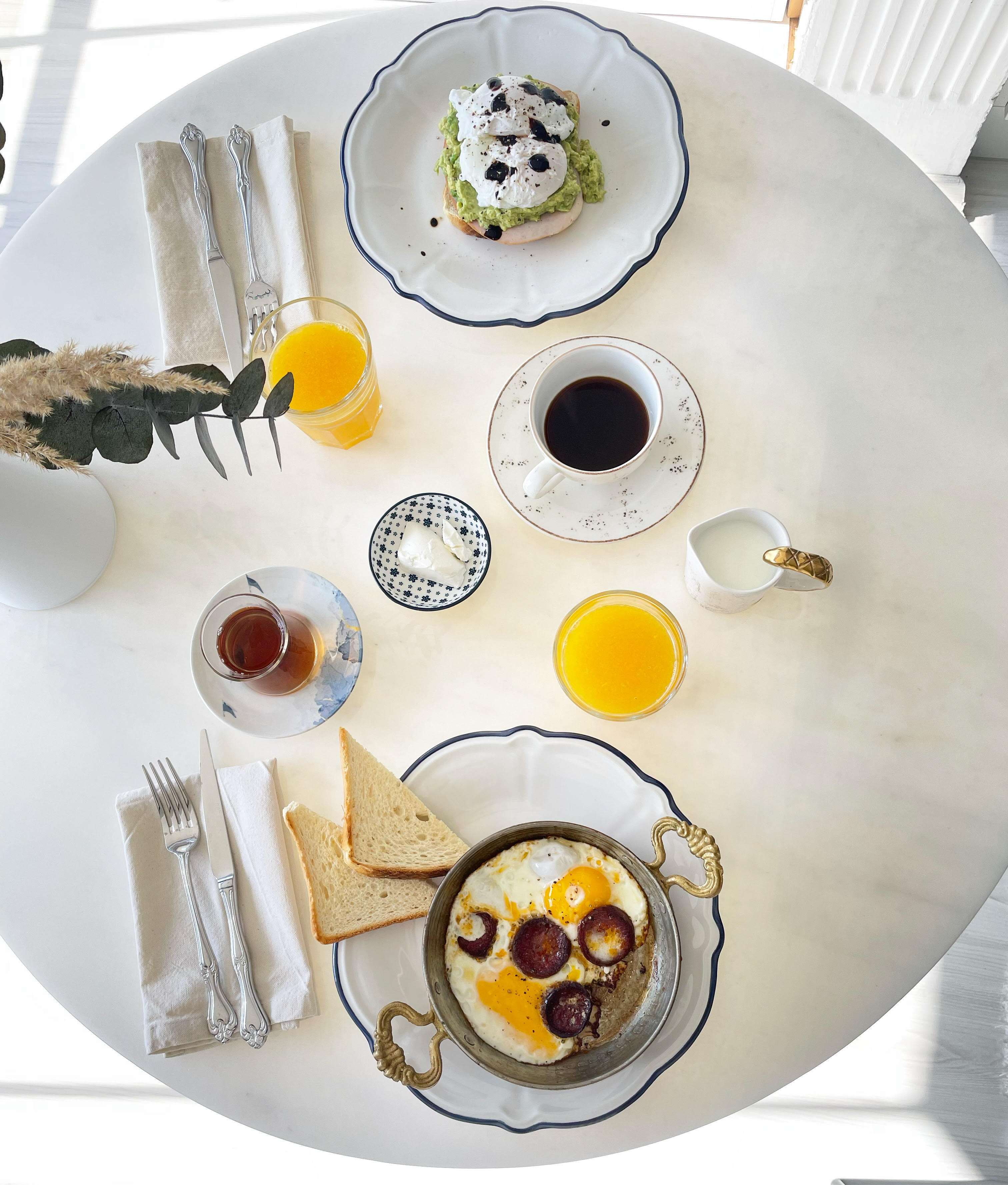 Tobuli pusryčiai būna tada, kai stalas nuklojamas daugybė įvairių lėkštelių su maistu. Tai būna arba turkiški pusryčiai arba eggs benedict, blynai, košės, french ar avocado toast. Viskas patiekiama minimalistinio dizaino, bet tuo pačiu prabangiai atrodančiose lėkštėse. Gražūs įrankiai, lininės ar medvilninės baltos servetėlės. O privalomas pusryčių elementas – šviežiai spaustos apelsinų sultys, kurios patiekiamos vyno taurėje. Fone skamba prancūziška lėta ir rami muzika. Jei paskiriu laiko pasiruošti būtent tokiems pusryčiams, man juos patinka valgyti su vyru. Vis dėlto, labiausiai man patinka pusryčiauti vienai pačiai: būti akimirkoje. Žinoma, tokiu atveju sau pasiruošiu tik vieną patiekalą.