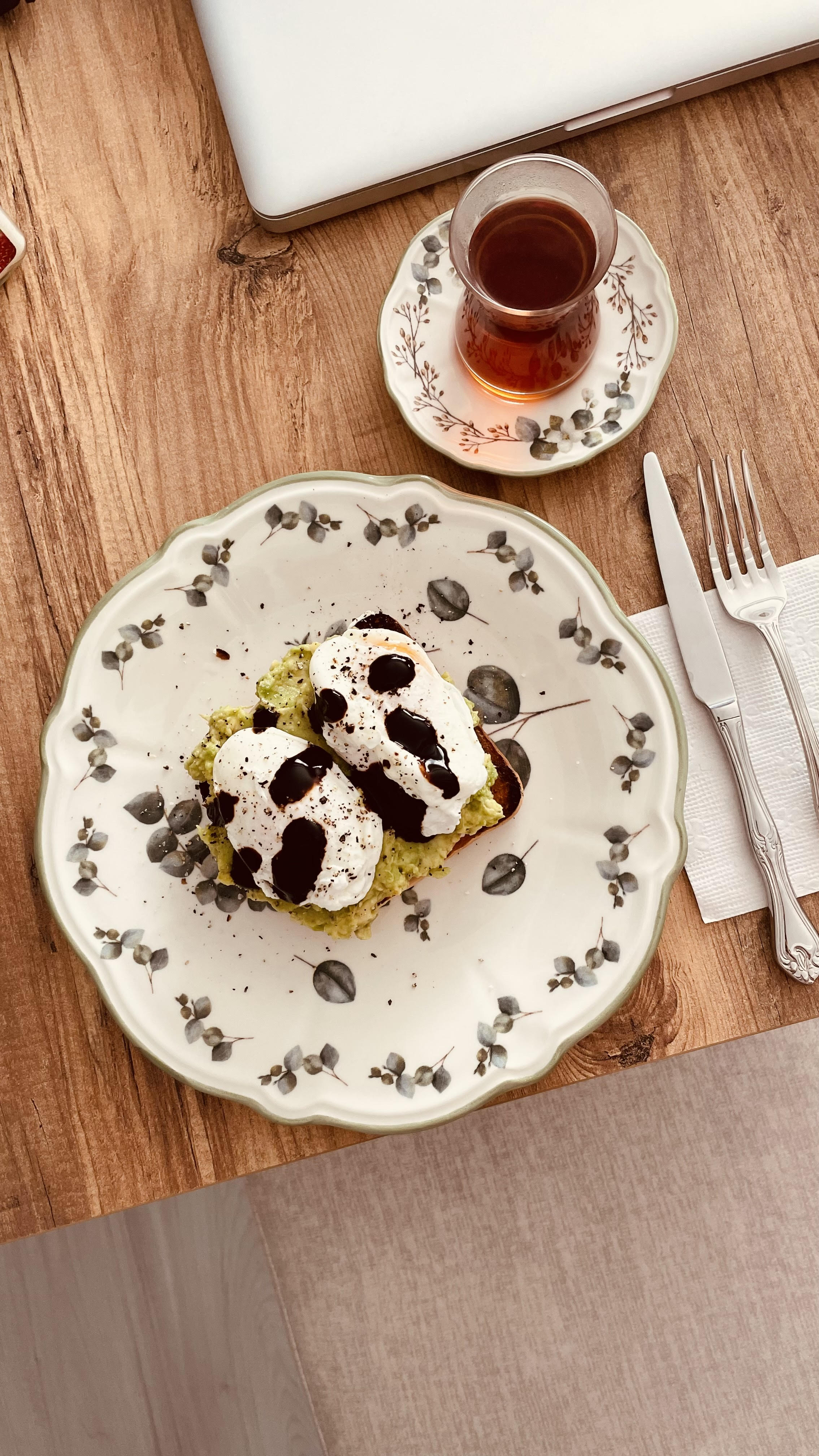 Šiuo metu, tai mano pusryčiai su avokadu. Avokadą sutrinkite su šakute, įspauskite citrinos sulčių, šiek tiek aštraus padažo, druskos ir juodųjų pipirų. Viską išmaišykite. Ant skrudintos duonos tepamas sūris, dedama karštai rūkytos kalakutienos krūtinėlės filė. Jūsų pasiruošta avokado masė, poached eggs, juodieji pipirai ir baziliko actas dedami ant pačio viršaus. Niekaip negaliu atsivalgyti šių pusryčių, nes jie – tiesiog tobuli!